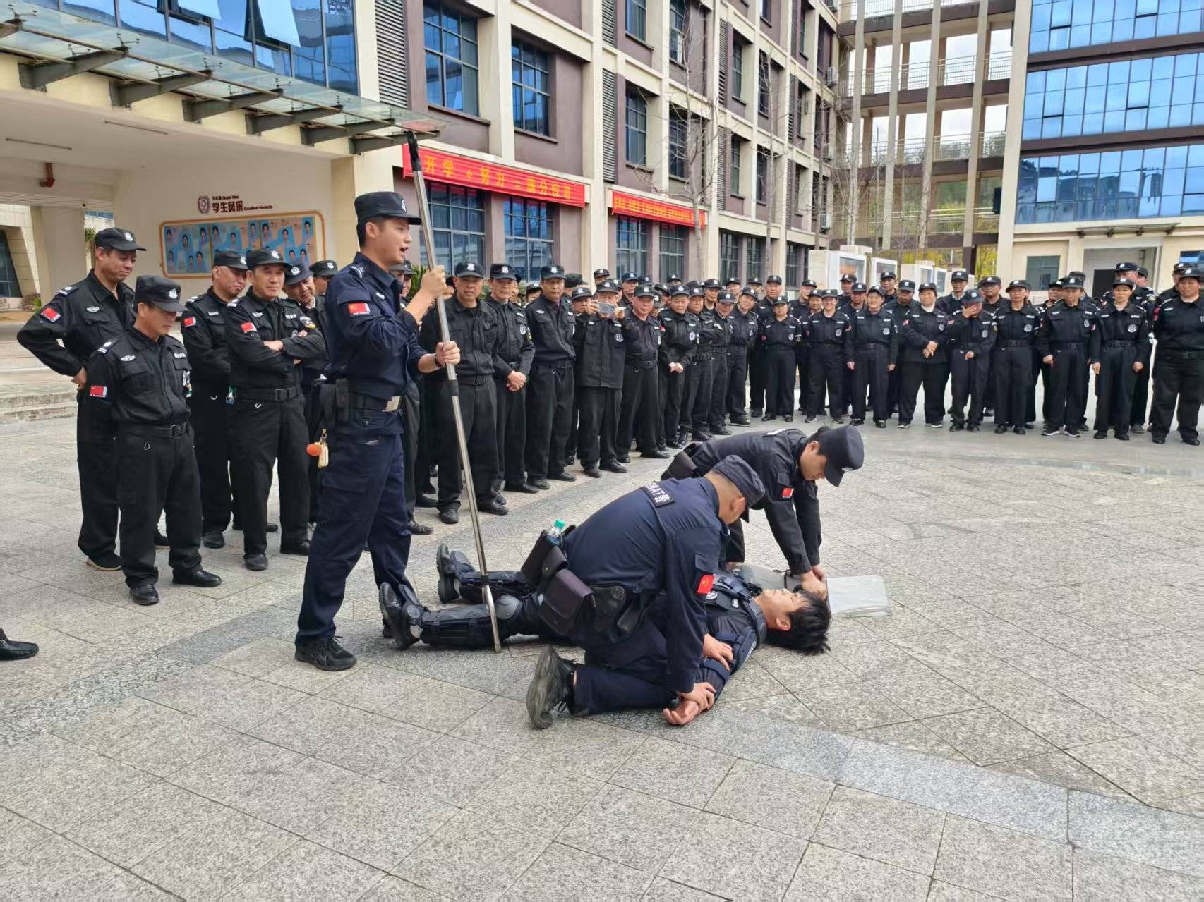 此次培训重点突出安保理论学习、警勤器械操作和消防灭火校园安保操作使用等方面内容,采取理论授课和实装演练相结合的方式,让参训人员系统学习了校园安全管理相关法律法规、应对突发事件处置流程、校园安全管理方预案等内容。同时,围绕校园技防设施、日常巡查和应急处置,开展警绳、警棍、盾牌、灭火器、消防水枪实操、消防安全等实战方面业务知识培训,并开展了火灾应急疏散、门岗遭到冲击实案化应急处置演练,穿插介绍防灭火常识、逃生自救方法,有效应对突发事件,保障校园安全。